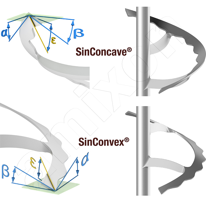 Ein wesentliches Merkmal von SinConcave® und SinConvex® ist die gezielte Neigung der Förderwendeln nach innen oder nach außen. Untersuchungen und langjährige Praxiserfahrung zeigen, dass diese Geometrie sowohl die Mischeffizienz als auch die Restentleerung deutlich verbessert.