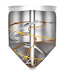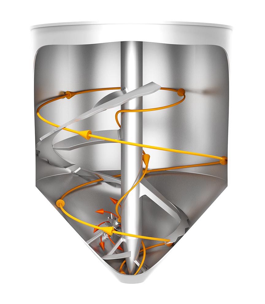 amixon® mixing technologists have engineered a conical powder mixer with a spiral mixing blade capable of operating either as a batch mixer or a continuous mixer. The AM batch mixer and AMK continuous mixer both initiate a three-dimensional flow within the mixing goods and can be programmed for a range of mixing intensities from gentle homogenization to intensive deagglomeration.