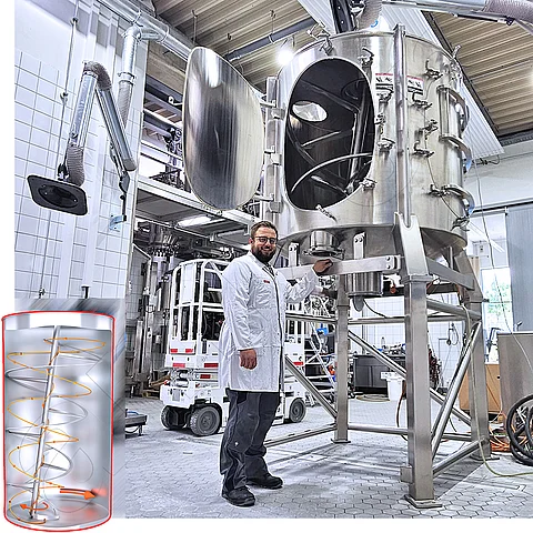 Certain performance indicators apply to such processes. The specific drive power is at least 7 W per litre of mixed material and can be twice as high in some cases. A batch of 10 m³ therefore requires a drive power of at least 70 kW. The larger the batch, the greater the drive power required. This can be very high, especially with high bulk densities or poor flowability of the powders.