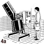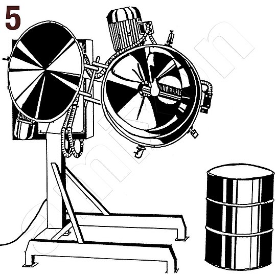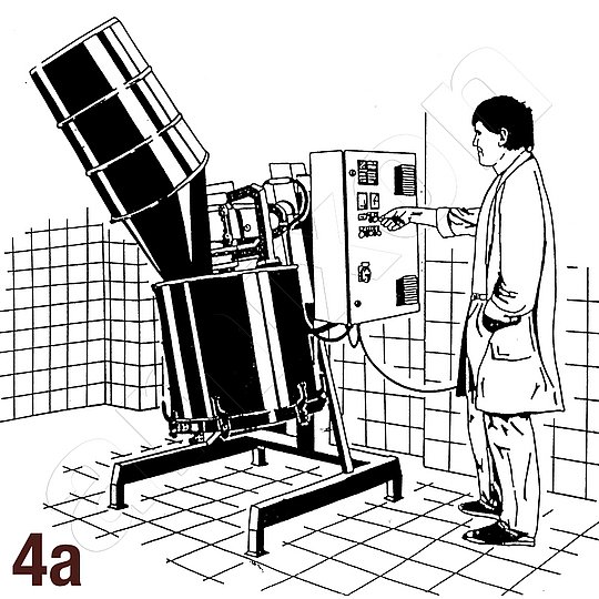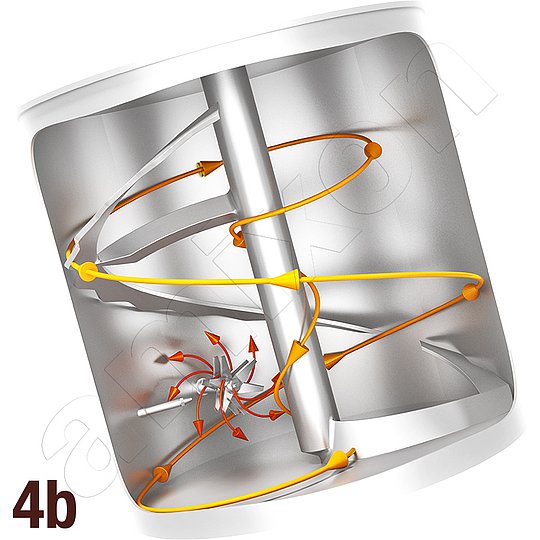 4a + 4b) Mezcla en varias posiciones inclidas; opcionalmente, desaglomeración suave o intensiva. De esta forma, aquellos componentes adicionales líquidos pueden también ser mezclados excelentemente junto con los materiales en polvo. Tras la mezcla, se sigue el mismo procedimiento en orden inverso.