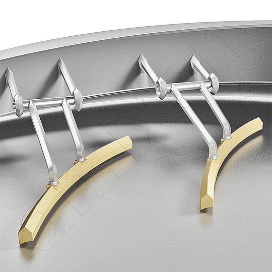 Las mezcladoras amixon® vacían hasta el 99,997 % y mejor con ComDisc®. Las herramientas ComDisc® se montan en el brazo inferior del mezclador. Durante el proceso de mezcla, el ComDisc® se encuentra en la sombra del flujo y flota sobre la mezcla. A medida que disminuye el nivel de llenado, las herramientas ComDisc® se hunden hasta el fondo del mezclador. Al hacerlo, empujan la mezcla restante hacia la salida. Casi toda la mezcla se descarga de forma muy rápida y eficaz.