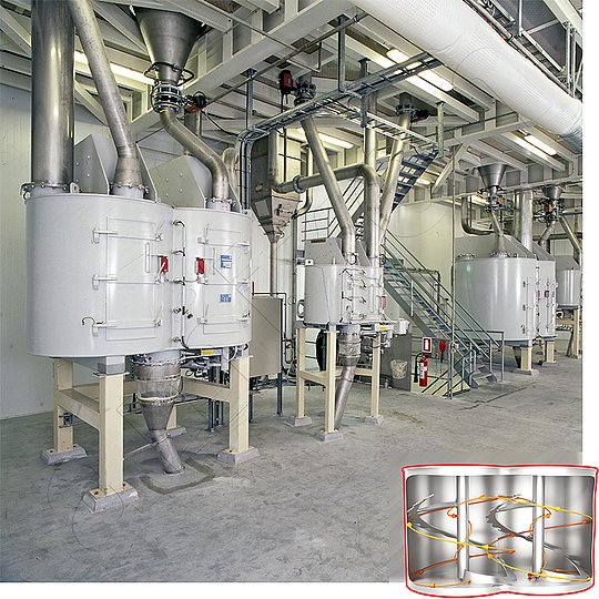 El mezclador Gyraton® también está disponible como aparato de ensayo con un volumen útil de 4000 litros. Los resultados de las pruebas pueden extrapolarse a aparatos grandes. Esto proporciona una base fiable para las decisiones de inversión.