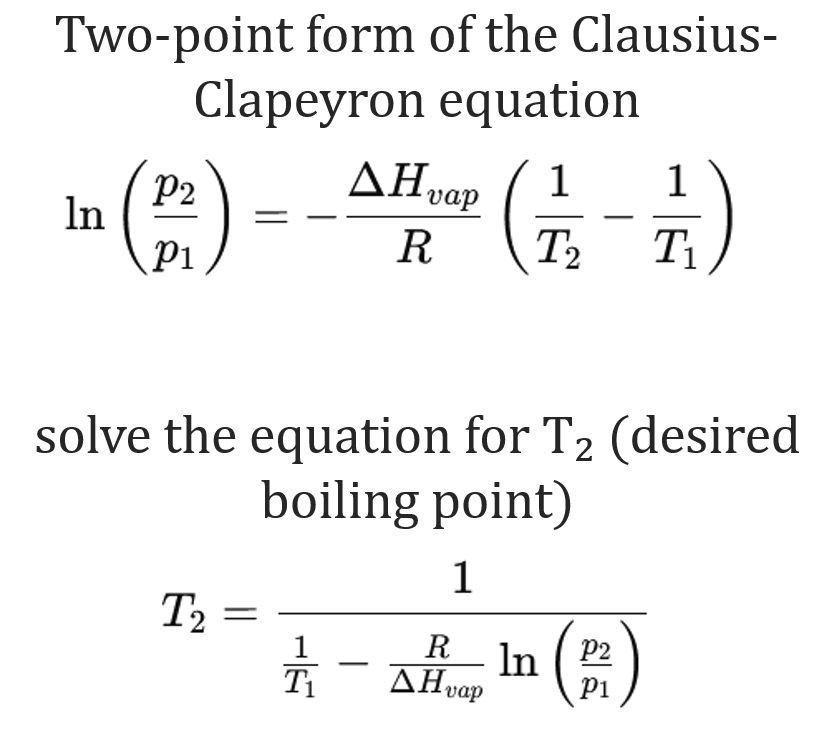 T₂ = 1 / (1/T₁ - (R/ΔH_(vap)) * ln(p₂/p₁))