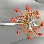 Le type d'introduction du liquide est déterminant pour éviter les dépôts. Il convient d'éviter les gradients de concentration élevés. C'est pourquoi amixon® utilise des lances de pulvérisation équipées de buses adaptées. Le débit volumique du liquide dépend du pouvoir d'adsorption de la poudre et de l'intensité du mélange. Une vitesse relative plus élevée entre les gouttes et le flux de particules favorise une dispersion fine. Cet effet peut être décrit à l'aide du nombre de Weber.