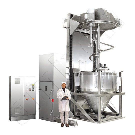 Photo de gauche: Mélangeur en conteneur amixon® de type COM. Ici, le conteneur de produits en vrac sert de récipient de mélange. L'outil de mélange est introduit par le haut dans le mélange et le conteneur est fermé avec le couvercle. L'outil de mélange effectue le travail de mélange dans le conteneur fermé de manière étanche aux gaz. Ensuite, l'entraînement passe en mode inversé. L'outil de mélange se « dévisse » lentement du mélange. Le mélange dans le conteneur est maintenant parfaitement homogène. Le conteneur est retiré.