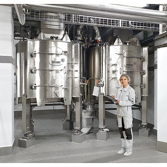 Une grande flexibilité. Un grand mélangeur amixon® peut alimenter plusieurs lignes de remplissage dans une usine L'alimentation du mélangeur en composants de matières premières pour aliments pour bébés se fait par le haut. Les poudres peuvent être introduites les unes après les autres ou simultanément. Pendant le remplissage, les outils de mélange doivent rester immobiles.