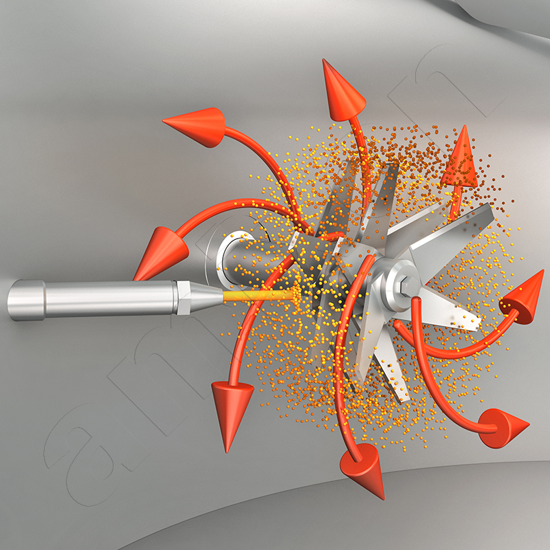amixon® désigne par « écoulement total tridimensionnel » l'écoulement complet et sans zone morte de l'ensemble du produit mélangé dans la chambre de mélange. Il en résulte une répartition statistiquement aléatoire du système dispersé, soit une qualité de mélange idéale.