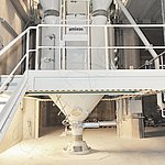 上図のAMK 10,000連続ミキサーはロードセル上に設置されており、その上方に設置されたコンベヤーは高精度の重量測定式計量システムです。連続運転時には、ミキサーは最大120 t/hの処理能力を発揮します。しかし、質量流量は20 t/hまで減らすことも可能です。