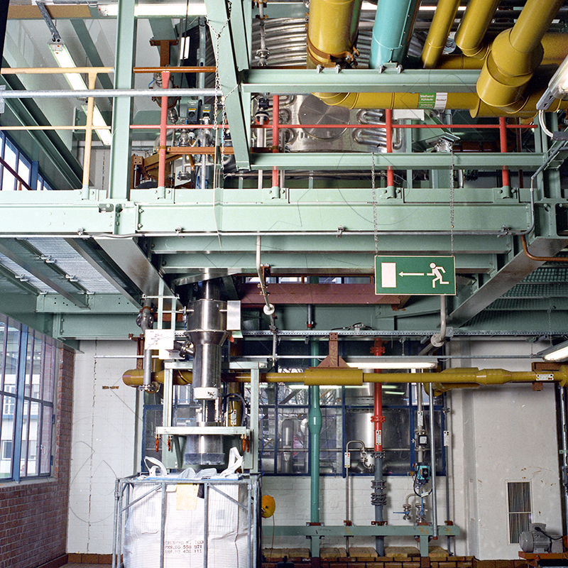amixon®ミキサーを使用する場合、ビッグバッグへの充填は通常、ミキサーの真下にある排出装置を介して行われます。この排出装置には延長ノズル、回転弁、およびベローズが備わっており、ビッグバッグの投入口に密閉して接続されます。排出量は、流動性の低い製品であっても、ビッグバッグの目標重量を正確に達成し、充填不足や過充填を防ぐように制御されます。