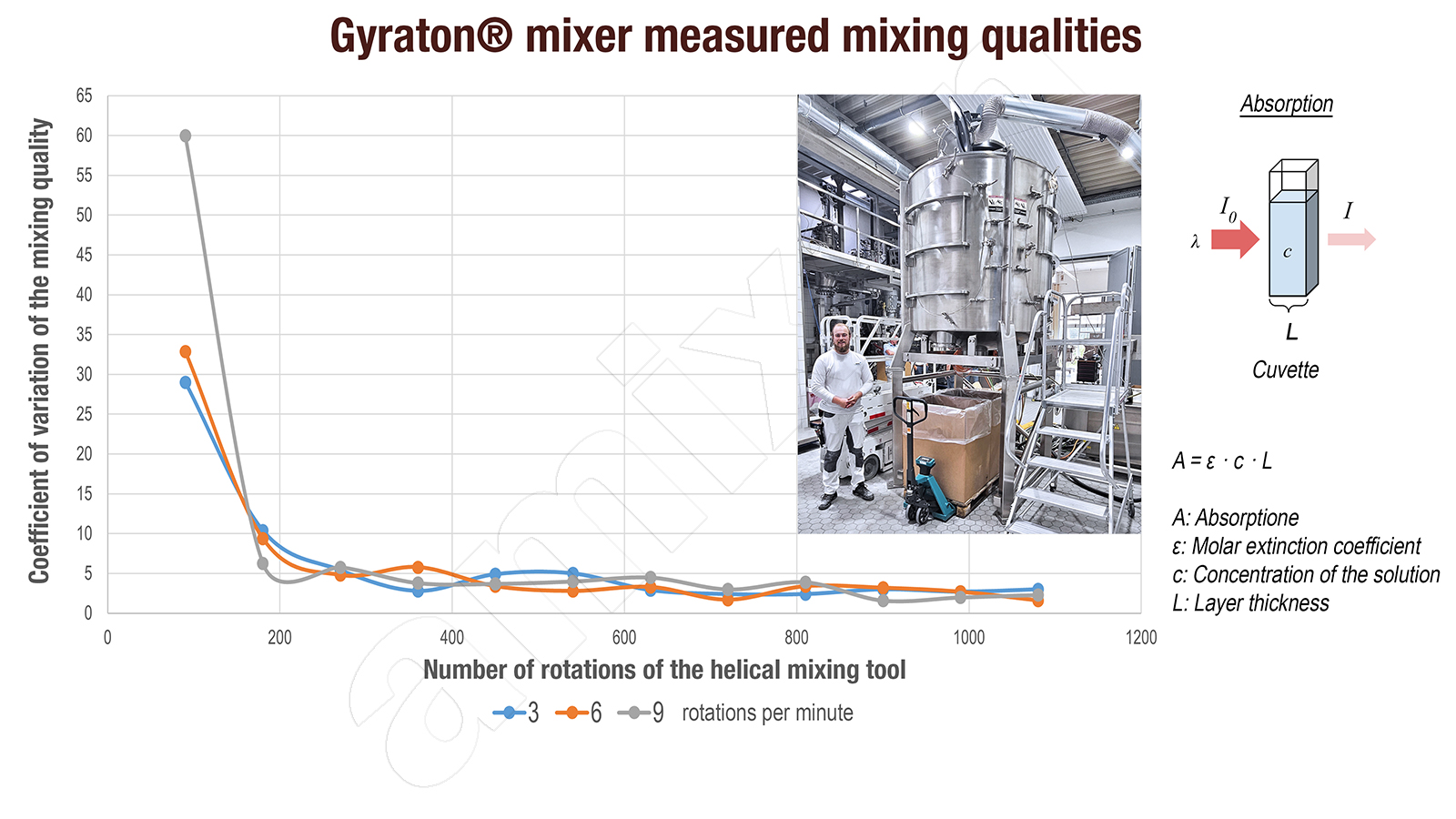 Gyraton® 믹싱 툴은 매우 낮은 회전 주파수에서 작동하면서도 이상적인 믹싱 품질을 구현할 수 있다고 가정할 수 있습니다. 이는 입증되었습니다.