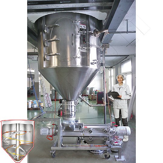 Posiadanie do dyspozycji jednorodnie wymieszanych surowców jest wielkim przywilejem dla kierownika produkcji. Upraszcza to kolejne etapy procesu i gwarantuje stałą jakość produktu końcowego. Mieszalniki Gyraton® firmy amixon® wnoszą tu cenny wkład. Na przykład, gdy zawartość 40-stopowego kontenera głębinowego (ok. 70 m³ materiału sypkiego) wymaga homogenizacji. Spirala mieszająca obraca się powoli i miesza wszystkie cząstki proszku od dołu do góry. Przy tym spirala mieszająca przesuwa się powoli wzdłuż ściany komory mieszania. – podobnie do wirnika Również Gyraton® mieszalnik może całkowicie rozładować zmieszane materiały. Następnie jest on wyposażany w narzędzia ComDisc®.