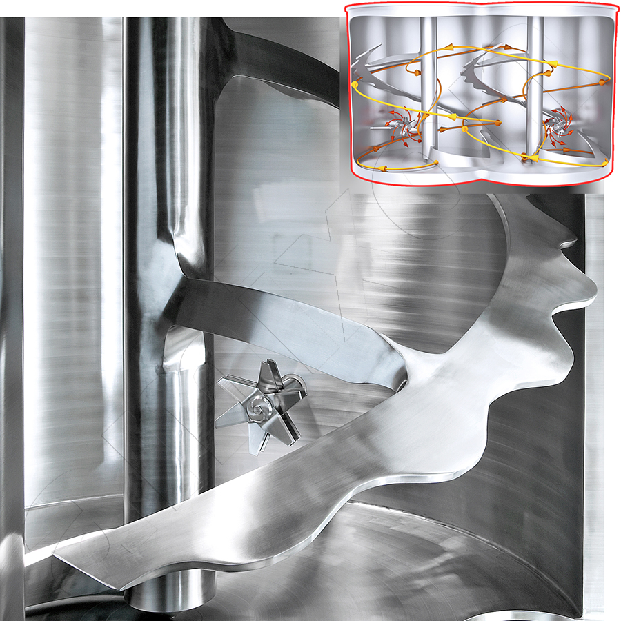 - Mieszalnik HM (pionowy mieszalnik dwuwałowy): bardzo krótki czas mieszania, wysoka jednorodność, wyposażony w elementy opróżniające ComDisc® zapewniające niemal całkowite opróżnienie – idealny w przypadku częstych zmian produktu