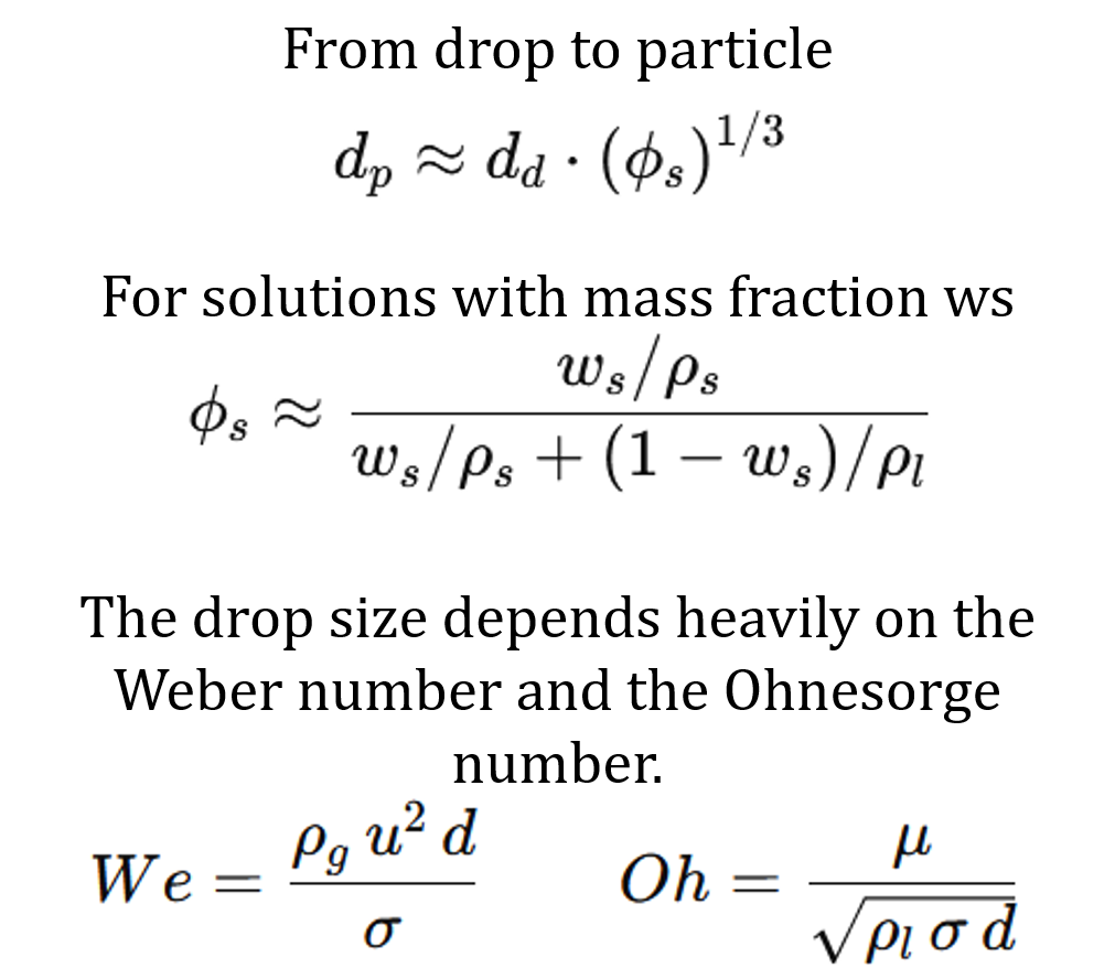 Empiryczne wzory przybliżone dotyczące wielkości cząstek: od kropli do cząstek proszku: Gdy kropla zawierająca substancję stałą wysycha i przekształca się przy tym „bez strat” w cząstkę, w przybliżeniu obowiązuje następująca zależność: