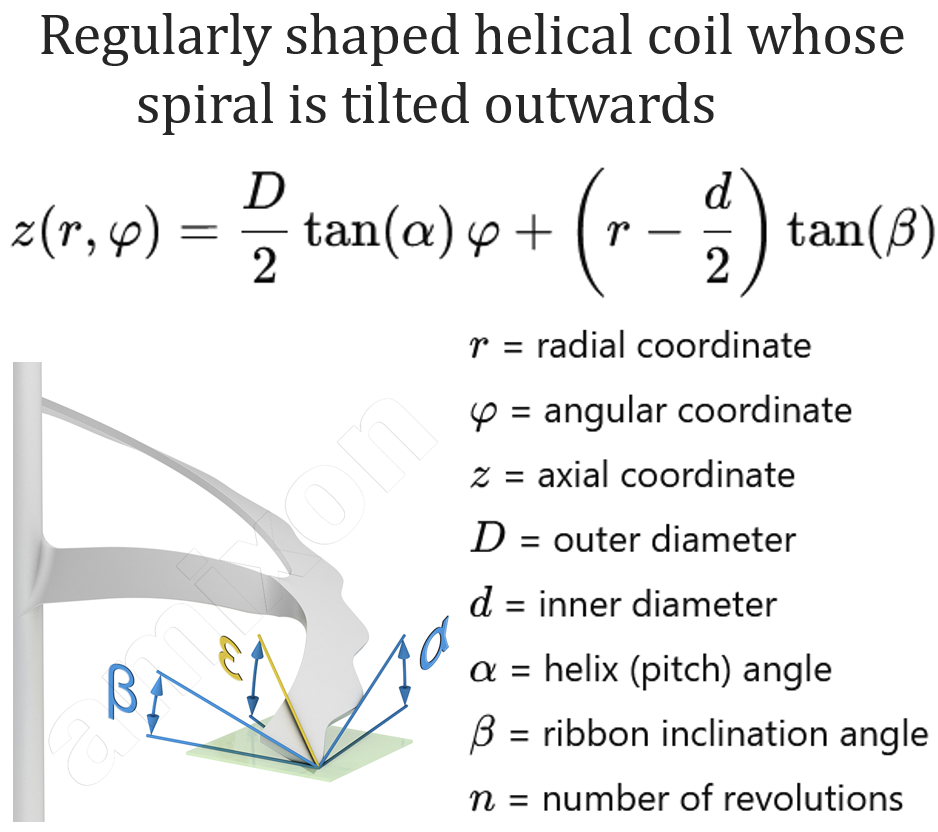Taśma śrubowa jest odchylona na zewnątrz. Kąt odchylenia od płaszczyzny poziomej wynosi β. Powoduje to dodatkową różnicę wysokości wynikającą z promienia. Jest ona traktowana jako funkcja liniowa od r. Ogólne równanie powierzchni taśmy w układzie współrzędnych cylindrycznych (r, φ, z) można zatem zapisać w notacji słownej w następujący sposób: