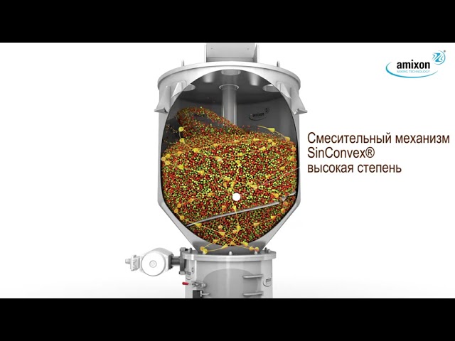 Достигнув самого верха, материал опускается и опять направляется с помощью конуса к стенкам. Процесс гомогенизации проходит на границе потока поднимающегося материала и потока опускающегося материала. Такая обработка очень бережна и эффективна. Идеальное качество смеса достигается примерно за 20—30 оборотов. Улучшение качества после этого практически невозможно. Затем путем опускания вытеснительного корпуса на несколько сантиметров обеспечивается быстрая 100%-ная отгрузка.