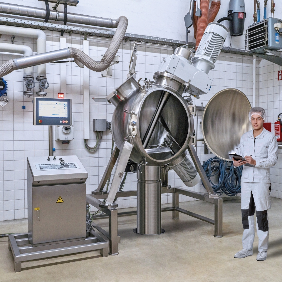 Эти требования распространяются не только на небольшие партии, но и на большие объемы и промышленные производственные мощности. Движение смешивания должно равномерно действовать по всему объему, оставаясь при этом бережным к продукту. Таким образом, можно обеспечить постоянную сенсорную консистентность даже при увеличении объемов производства.